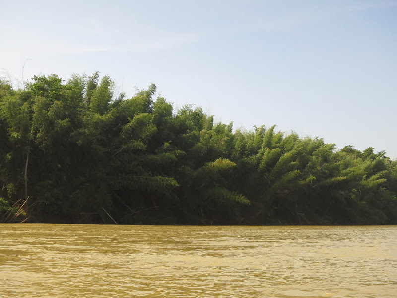 Мы перегружены своим бамбуком, увязали его сегодня неправильно, поэтому лодка уваливает влево. Мы задалбываемся её подправлять, но её это не смущает.