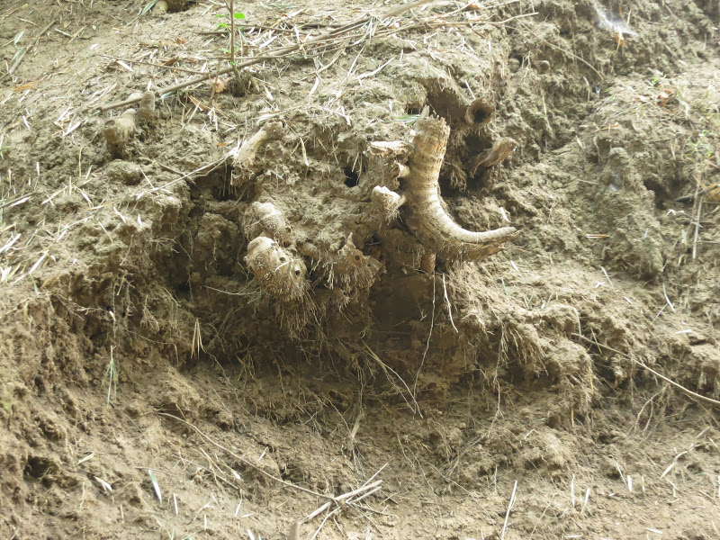 Роскошный пень торчит у воды, к нему зачалены наши лодки. Сам он служит мне раздевалкой и вешалкой для вещей, а его корни одновременно лесенкой в воду и перилами. А так же — страховочными перилами, когда я уже мотаюсь в воде, течение тянет — руки не разжать, утянет совсем. Глубоко здесь.