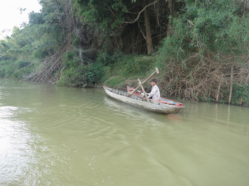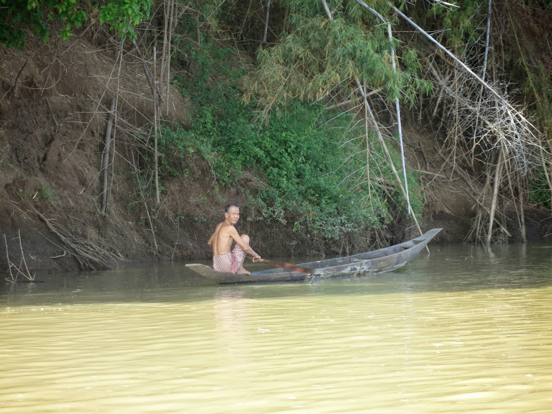 Забираюсь на корму, на свое место. Вёсла у нас с разворотом, бедный кхмер никак не приноровится — мало того, что лопасти две, да еще и коварно развернуты одна относительно другой. Наконец, получается сделать несколько гребков, делаем небольшой круг. Кхмерский водник, недовольно цокая языком, выбирается из лодки. «Тяжелая, говорит, плохая лодка ваша», — перевёл Олег.
