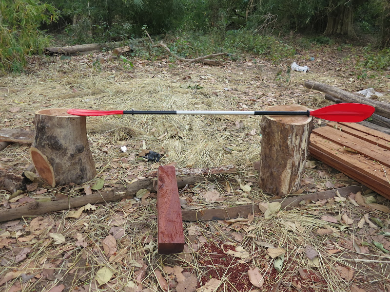 Компанию в рюкзаках нашей лодке составили каски, спасжилеты, вёсла и «лягушки». Личного барахла набралось килограмма три, не больше. Флисовый плед, коврик, несколько сменных маек, светлая рубашка с длинным рукавом, инсектициды от малярийных комаров, солнечный крем и сменная обувь — легкие сетчатые кеды. Двое штанов — одни для сплава, другие для берега — сейчас были на мне. Обе пары. В Москве всё-таки тоже декабрь :). Вся теплая одежда в виде майки с длинным рукавом и тонкой любимой мармотовской ветровки тоже в момент регистрации были на мне.