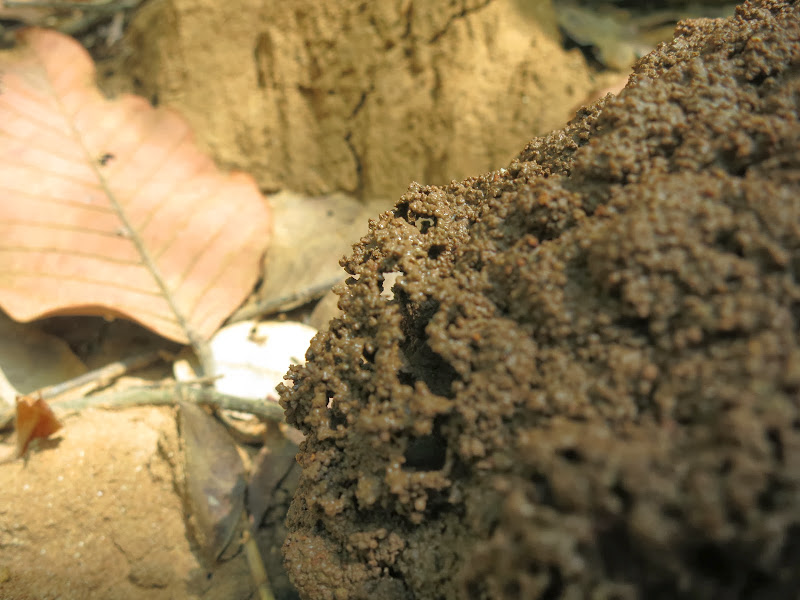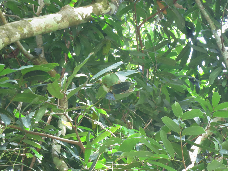 И муравьи со своей гусеницей сейчас как по веревочке поднимутся по усу лианы на ветки у нас над головой, а концевые листья у этих веток этими же муравьями склеены-сшиты по краям, образуя такой сшитый домик. Там у них муравейник, туда они и тащат — надрываются свою тяжеленную добычу.