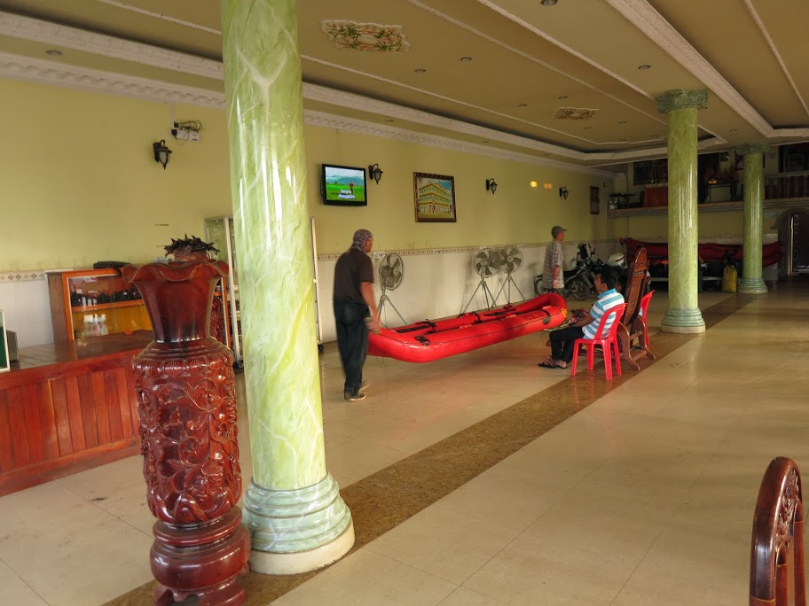 Представьте себе чистенький просторный холл, отделанный под мрамор, с колоннами, с огромными напольными вазами красного дерева, с резной мебелью, столами и стульями красного же дерева. И рядом — три мокрые надутые лодки, сложенные друг на друга, гермомешки с продуктами, коврики, скатанные в рулоны, чумазые рюкзаки, чумазая же сумка с кастрюлями и прочей кухней. Как все это называется? Правильно, Г-ще. Водники-то знают. Вот я и говорю, что научила команду новому слову. Нужно овладевать предметом. И специальным сленгом тоже. Иначе какой же ты водник? 🙂