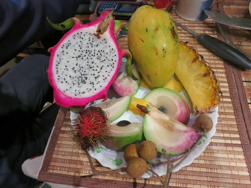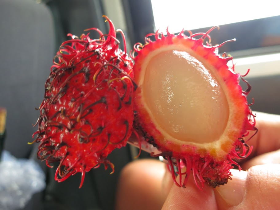 Ребята покупают нам с Лёхой пакет лохматого РАМБУТАНА, тоже фрукт тропический. Ещё каких-то яблоко-груш.