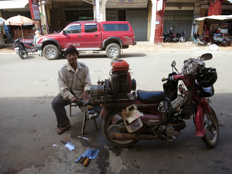 Люди улыбаются. Когда встречаешься взглядом — улыбаются почти всегда. Запомнился мне один точильщик ножей, кхмер. На багажнике мотоцикла у него приделан точильный станок, с собой табуреточка. Ездит по кафешкам, по рынкам, к торговкам рыбой и овощами, точит им за деньги ножи. Тем и живет.