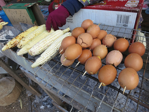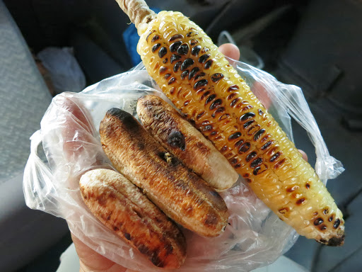 На какой-то остановке удивляют шашлык из яиц, печеные кукуруза и бананы.