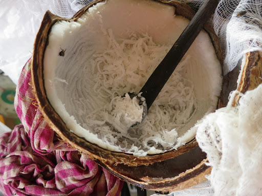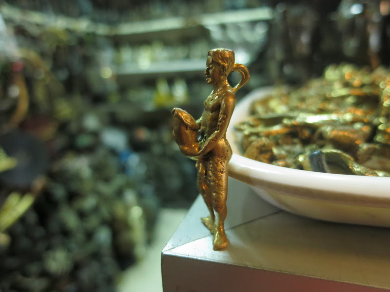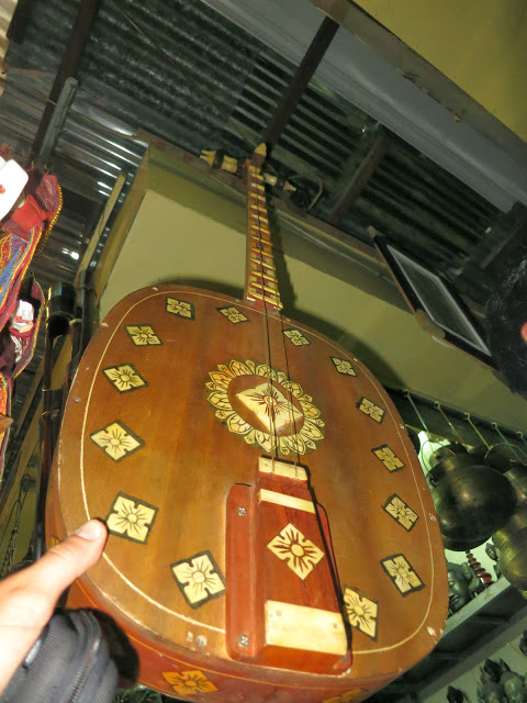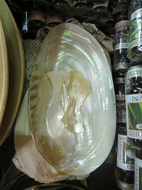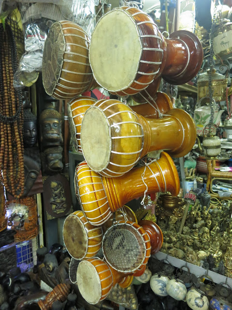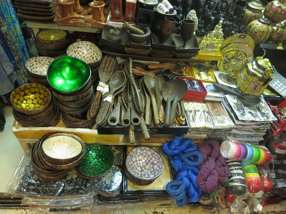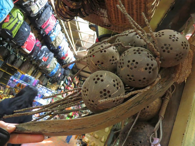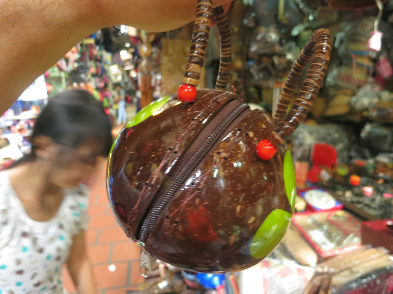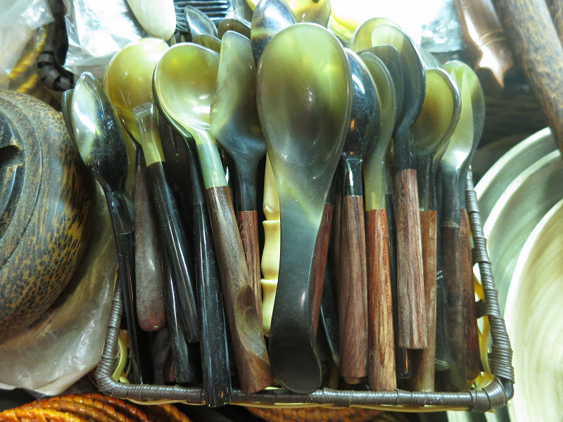Меня извиняет только то, что я перефотографировала там всё, что можно — медные котелки и деревянные колокольцы с шеи скота, бамбуковые письмена на санскрите, местную двухструнную балалайку и барабаны со змеиной кожей, оружие какое-никакое, ложки из красного дерева и рога баффало, тарелки из перламутровых раковин, рюмки из пальмового дерева, вазочки из обработанных и украшенных перламутром скорлупок кокоса, кокосовые сумки, поделки, черпаки, даже бронзовые эротические фигурки. Посмотрев дома фотографии со всей этой страшно увлекательной мишурой, мои дети объявили, что в Камбоджу стоит ехать уже ради Russian market. Запишите себе названье, чтобы в спешке не забыть 🙂