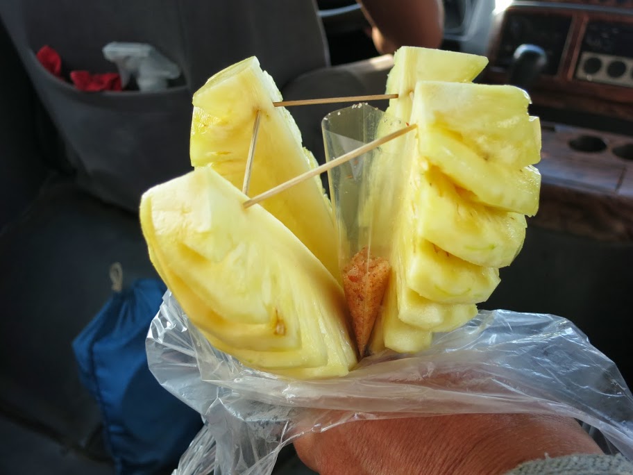 В числе прочих деликатесов купили несколько чищенных ананасов, раскрытых с помощью зубочисток в виде цветка. Внутрь, как водится, вложен пакетик с оранжевой перченой солью.