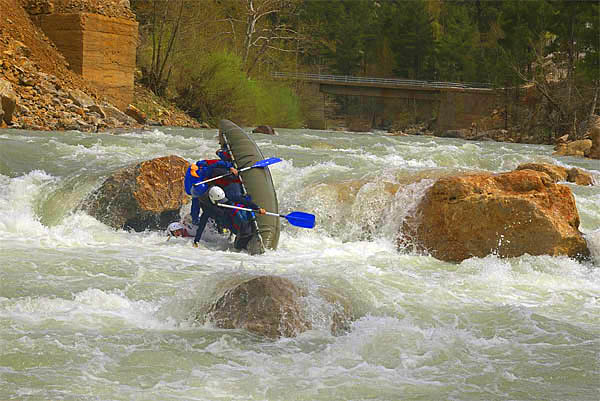 | 2 | N36 44.931Е32 27.989 | Препят ствие № 2 Пор. «Очко» IV кc. | 100 м. | Трек, слаломный, водопад, завалы. Осмотр, фото-видеосъемка с правого берега и с воды. | Сложная лавировка между камней. Допол нительную трудность для нашего прохож дения создавало бревно, вертикально застрявшее между камней в середине порога. |
