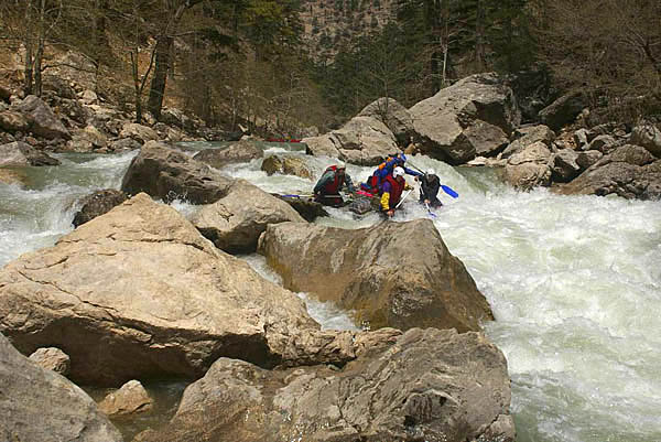 Через 200 метров следующий серьезный порог IV-V к.с. — осмотр по правому берегу. Протяженность 400 метров, основная струя уходит под левый берег, оставляя еле габаритные проходы, и далее идут чистые сливы. Страховка с правого берега и с воды.