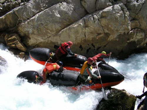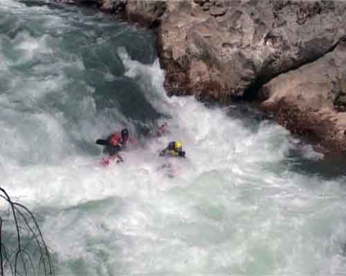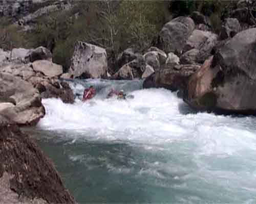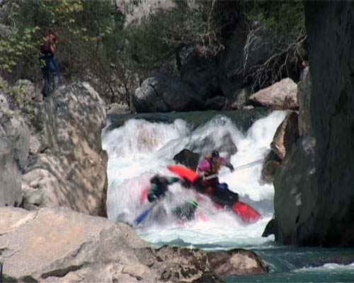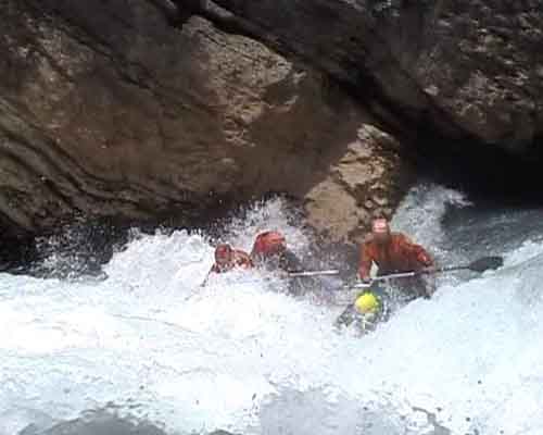 К обеду подошли к порогу внушающего уважение. Полностью осмотрев его по правому берегу, набрали один отважный экипаж на прохождение, остальные на фото – видео съёмке и страховке ниже порога. Порог — 5 международной классификации с манёврами и водопадными сливами, с прижимами и хорошим уклоном, одним словом -Super. Отчалили от берега, я слышу странные как-будто крики, но откуда тут взяться людям, подумал я – померещилось. Почти вышли на струю – тут уже все услышали крик. Это Ромка из последних сил пытался нас догнать по противоположному берегу. Видно сильно устал, т.к. вылезти наверх из каньона реки не смог. Он оказался в тупике, и у него осталась одна надежда догнать основную группу.