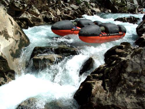 Утром Борька связал из двойки приличное (с дугами) 5–е седалище в центре нашего ката, а остатки двойки привязал к раме — для укрепления :). Проходим двумя четвёрками порог. Всё прошло как по нотам. Прыгали на разгруженных катамаранах справа под струи подземных рек. У места чалки стояла береговая страховка, которая помогала зачалиться.