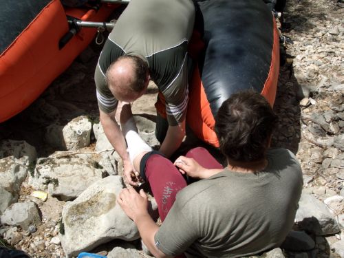 Обнялся из последних сил с «булыганом». Парни из его экипажа за ним по левому берегу уже скачут по камням. Вытащили на берег. Живой. Весло в руке, а сам еле дышит. Воды напился. Иринка ему таблетку дала. Ушиб ногу – хорошо что был в полной защите. Ногу перевязали, воду из Коли отлили.