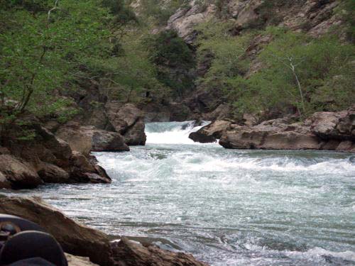 2. От моста, со слов егеря, сплав никто не начинал. До дороги узкое ущелье со стенами 50-100м, сложные пороги 5 межд. к.с.. От подземной реки расход удваивается. Стоянки сложные. Многие препятствия требуют тщательного осмотра с горными навыками. На участке завал и в конце каньона водопад в щеках, который трудно посмотреть, а надо. По правой стенке прошли на веревке, остался карабин на петле в нише.