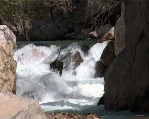 Глубокое непроходимое вдоль воды ущелье, часто каньон без выходов. В нашу воду — один непроход (вода проходит по завалом — обнос 20м по глыбам). Порги водопадного типа в коренных породах, есть слалом между упавших глыб. Падение значительное. Нужно быть готовым к сплаву 5 междунар. к.с. в сложных береговых условиях. Соства группы 10 чел, 2 ката четверки, 1 двойка. Уровень подготовки и схоженности экипажей высокая.
