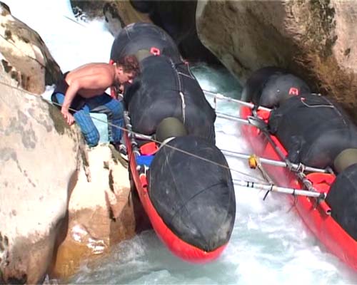 С утра решили спускать разгруженный кат с экипажем и «альпинистом» на верёвке вниз по течению. Альпинистом был, Димка который вбивал крючья в стену и делал закладки в трещинах,  через которые протягивали верёвку. Планировалось спуститься ниже стенки по течению, осмотреть порог, потом решить как действовать дальше. После стены можно зачалиться на правом берегу, но чалка очень криминальная, если не сможешь — уйдёшь неизвестно куда и не  понятно как. Стали спускать кат на веревке вниз. Ребята набили несколько крючьев в стене, повесили верёвку на карабинах. В самом крутом повороте в прижимчике катамаран сильно придавило. Чуть не кильнулись. Спасло то, что трое сидели на нужном баллоне и держались о каменные выступы. Еле-еле проскреблись вдоль отвесной скалы и выбросились на берег. По рации передали, что за поворотом ничего супер страшного нет, хотя все равно мощный порог   «бочарой» через всю реку. Навесили веревку. Долго думали- трендели по рации – что делать дальше. Катамаран с экипажем обратно по веревке вверх по течению не вытащить – тяжело.