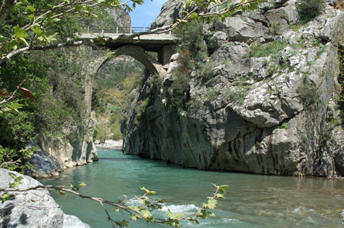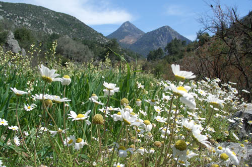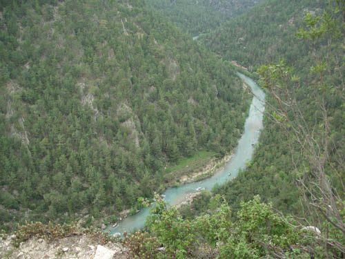 Разгрузились перед мостом через реку, включили фанарики, нашли площадку ниже дороги, перетащили на неё вещи, поставили лагерь и улеглись спать. Просыпаемся, а вокруг красота неписанная. Солнце пригревает, что в палатки не поспишь, а у нас дома снег до конца ещё не сошёл. Вверх по долине реки открываются белоснежные горные хребты переливающиеся на солнце. Бабочки с цветочка на цветок пархают. Птички щебечут на разные турецкие голоса. На берегах хвойный лес с цветущими кустарниками. Всё пахнет и благоухает, тоже не по-нашему. Вдохнешь воздух полной грудью, и выдахать не хочется. Речка мирно несёт своё течение по узкой, извилистой горной долине. Населения рядом невидно. Спокойно — как в раю.