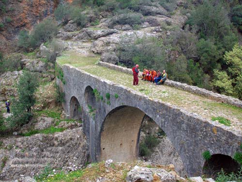 И все-таки на одном из обносов, порвали обо что-то шкуру катамарана четвёрки. Парни быстро всё зашили, и мы продолжили путь. 8 апреля в обед проплыли под очень живописным мостом. Его ещё римляне строили, он узок для современных машин, но для лошадей в самый раз. Но явных дорог и троп к нему нет. На мосту дественная травка.