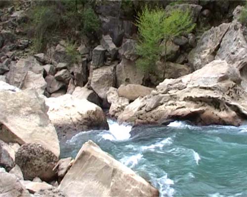 Наш экипаж также героическими усилиями влетел на большой камень на левом берегу и успешно обнёс водопад. Фотка сделана (http://seoma.narod.ru/turkey.htm) не нами, у них воды больше, но камень, через который мы обносили, просматривается. Следовательно, у нас проход был уже, более отвесный и глубже. По ходу движения на реке нас обогнали каякеры из Европы. Одно из самых примечательных препятствий на Аларе надо отметить порог Портер, который мы, как и все обнесли, но конечно же со своими приколами. У нас же катамараны, а таскать их тяжело, поэтому мы их решили сбрасывать по верёвке с левого берега на спокойную воду.