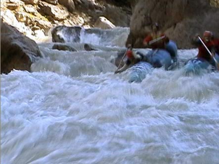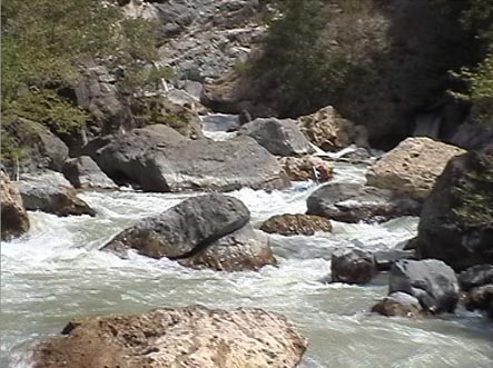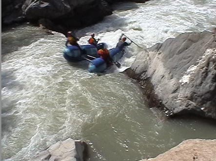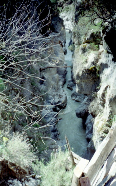 Каньон начинается стометровым быстротоком в отвесных стенках 15 — 20м, затем слева появляется полка вдоль которой сложнейший порог с <непроходом> в начале Ф2, затем каньон сужается Ф3. На этом участке несколько порогов-сливов и выходов коренных пород. Все <идется>. Перед щелью ниже пешеходного моста Ф5 есть понижение и возможность спуска к воде Ф4, где надо делать принудительную чалку перед <непроходом>. Каньон сужается примерно до 1м. Длина узости около 100м при высоте стенок 10м. На катамаранах непроходимо. После щели расширение русла и сложнейший порог завального типа (5+) на огромном уклоне (чем-то напоминает <Штольню> на Пскеме). Потом идет 500-600м каньона с несложными порогами. Но если заплыл ниже ручья впадающего с п.б., то вылезти из каньона нельзя. Отвесные стены поднимаются на сотни метров. Ф6 . Река перепилила гору пополам и на другой стороне поворачивает под прямым углом влево. Правый берег 3-5м скальная стена, а левый 100-200 м — отвесный. На повороте надо ставить принудительную чалку, т.к. сразу после поворота непроходимый сифон. Во время дождей и очень высокой воды (+2м к апрельской) сифон затопит, и появятся водопадные сливы через скалы. Обнос 3м. Дальше на 100м еще три непроходимых сифона. В большую воду все должно идтись (сл. 5+ — 6). Дальше простой быстроток до автомобильного моста. От пешеходного мостика до автомобильного моста надо идти по дороге правого берега. Она приводит к лесозаготовкам на горе, а правее и вниз идет тропа, по которой надо спускаться. Некоторые пороги останутся не увиденными, но они могут быть пройдены сходу. Без принудительной чалки перед пешеходным мостом и по выходе за гору — сплавляться нельзя, т.к. это может привести к смерти. Из каньона можно выбраться только в районе пешеходного мостика выше или ниже щели. В остальных местах отвесные стены от 10-15м до 150-200м.