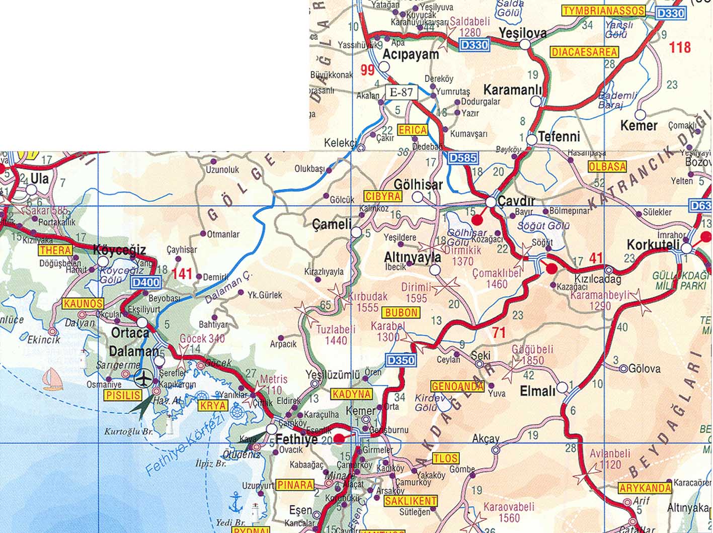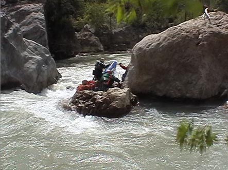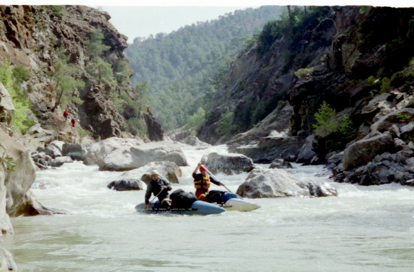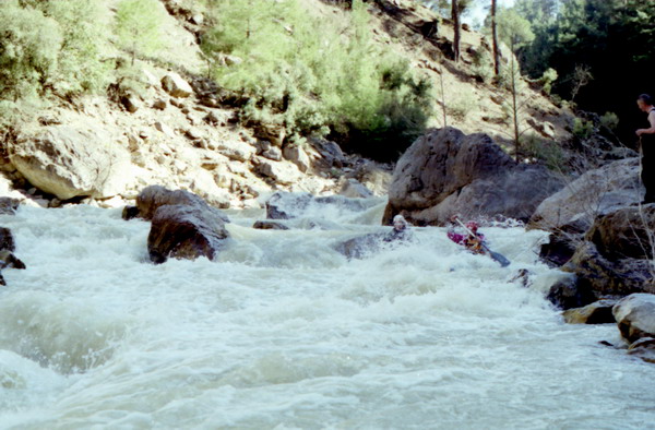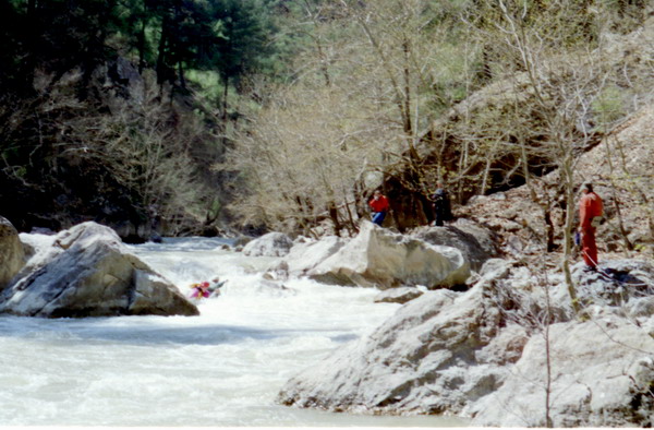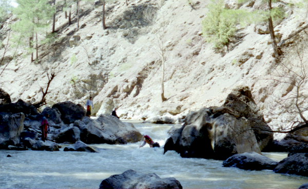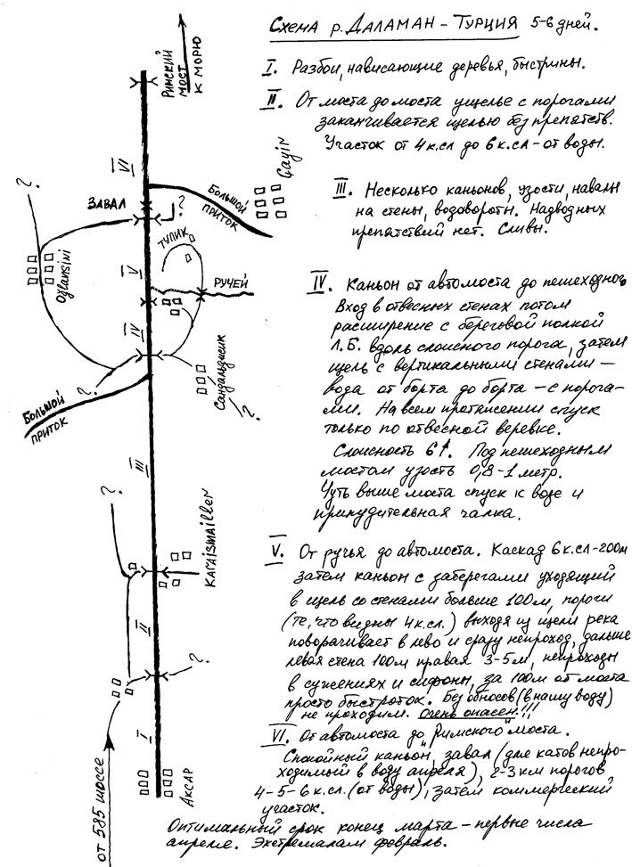 5 Апреля. После слякотной Москвы Анталья встретила нас теплом и зеленью. Было пыльно и по летнему жарко. 12-местный Фольксваген принял в себя все наше барахло вместе с нами, зарядился продуктами в супермаркете и рванул с приморской равнины к близким горам. Отличная трасса Е87 (шоссе 585 ) между Антальей и Денезли проложена по горному плато. Через 180 км поворот на Акалан и Kelekgi к занесенным вершинам хребта Golgeli Daglari вдоль которой течет Даламан. Снега в горах много, поэтому питание реки в начале апреля снежное. Расход воды в реке быстро растет и ниже поселка Аксар на левом берегу в сосновой роще разгрузились. Здесь хорошее место для сборки судов. Река в этом месте небольшая — 10 м в ширину, но глубокая — 3 м, и быстрая. Мы не знали, что нас ждет впереди. Реально первые 10-15 км идут разбои, навалы на кусты и деревья, на низкие пешеходные мостики. До автомобильного моста смысла сплавляться нет, хотя все <идется>, но не интересно. Дорога идет по левому борту реки, то отходя, то приближаясь к воде. Ниже поселка л.б. мост, выше которого начинается порог, а река входит в узкое ущелье. Это начало порогов Даламана. Остаток дня провели в разведке ущелья. Правый берег крутой склон ( бомы и осыпи ). По левому берегу высоко над водой идет дорога, которая приводит к концу ущелья. Там поселок, а река протекает под ним в узкой скальной щели. Препятствий в ней нет. Сверху автомост. Сразу за ним расширение долины.