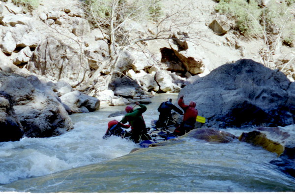 Пороги в ущелье разнообразные, требуют разведки. Уклон большой. С ростом объема воды сложность будет увеличиваться. Все препятствия проходимы. Сложность ущелья примерно 4+ в апрельскую воду. Есть водопадные сливы по 1,5 — 2 м и участки со сложной линией движения. Все ущелье единый порог. Места для чалок и страховки есть. Ночевали на полочке л.б. в 200 м выше скальной щели. Характер ущелья хорошо отображен на фото.