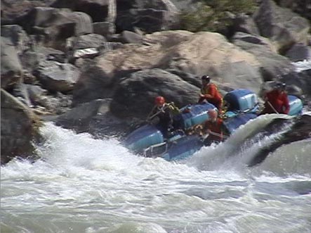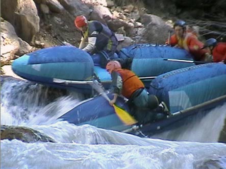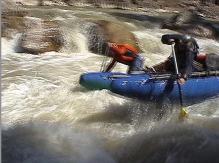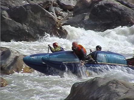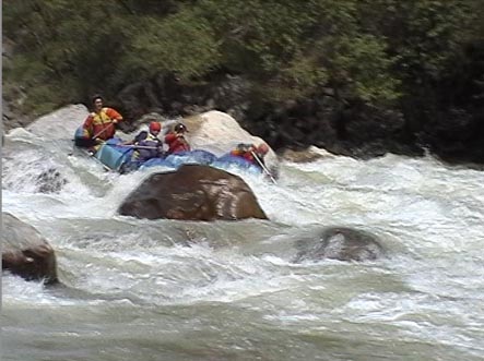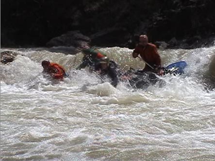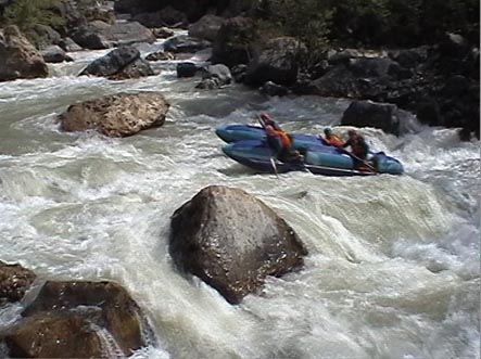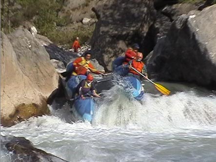 В километре ниже притока горы смыкаются. Река уходит в высоченные скальные щеки. Перед ними автомобильный мост. Выше моста на правом берегу хорошая площадка для стоянки. Удобная чалка. Это начало каньона и каскада препятствий от 4+ до 6 и <непроходов>. Остаток дня показал, что по обеим сторонам каньона, уходя серпантинами вверх, идет дорога. Переночевали. Утром двумя группами по обеим сторонам ушли на разведку. Взаимодействие осуществляли по радиостанциям.