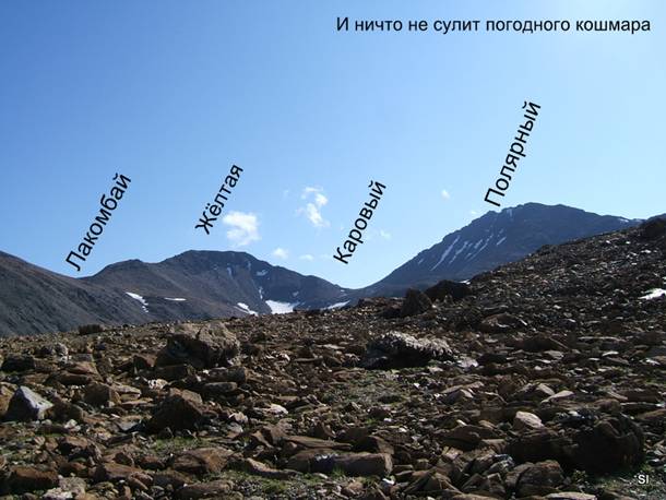 В 11.20 дошли до озера с отметкой 701,0. С СЗ появились кучево-дождевые облака, поднялся ветер. Надели штормовки и шапки. Оценили расклад времени. Поняли, что предполагаемый траверс Лакомбай-Жёлтая-Каровый-Полярный возможен либо в условиях полярного дня, либо при стоянке у озера 701,0.