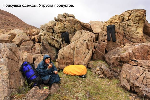 Попробовали растянуть стропу на скалах и подсушить мембрану, но куртки чуть было не улетели на юг. Только Поймали одежду, ввалил дождь. Я, опечалившись, уснул.