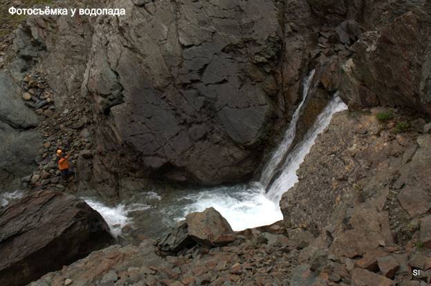 Ручей течёт в узком каньоне с высокими скальными стенками и водопадами. Под ногами россыпи разнообразных камней и минералов. Жаль, наша группа не сильна в геологии… особенно нам нравятся камни, имеющие структуру «чипсы» или «мюсли», ботинки удерживаются на них под немыслимыми углами. Зато протектор стирается немыслимыми темпами…После двух суток дождей пригодных для бивака мест нет, везде вода. Наконец, в районе 3-го от устья водопада находим шикарное место. Защищённая от ветра останцами полка, к воде – крутая скала. После небольшой планировки – идеально ровная площадка. Примерно 1 час ходьбы от вездеходки.