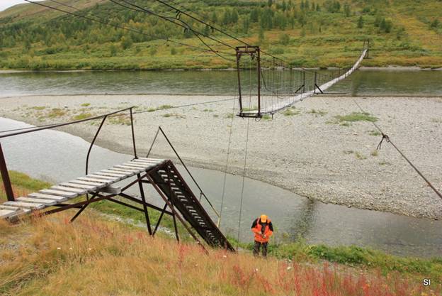 В 17.00 стоянка в 15 минутах ходьбы до вантового моста у ж\д станции Собь. Палатку не ставили, пока не сходил убедиться, что мост на месте и настил на мосту имеется.