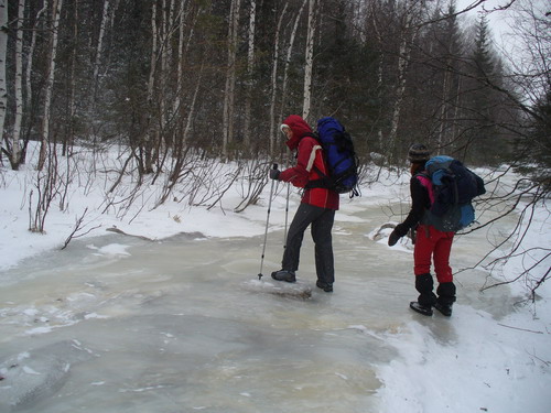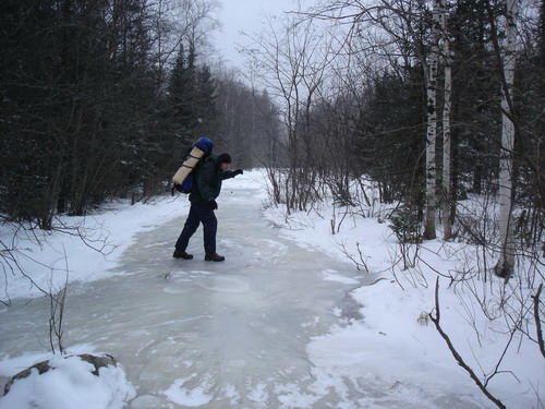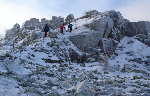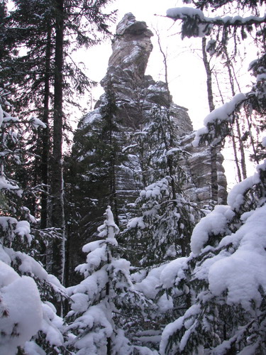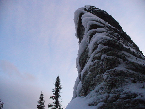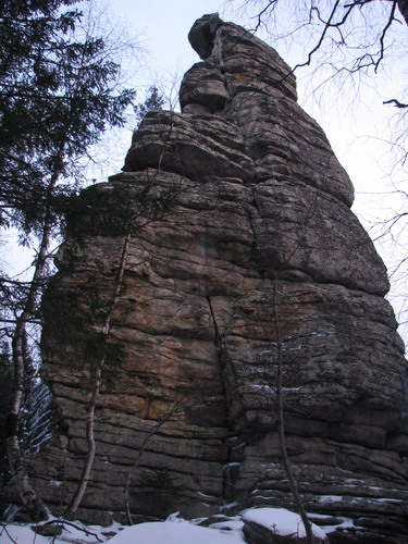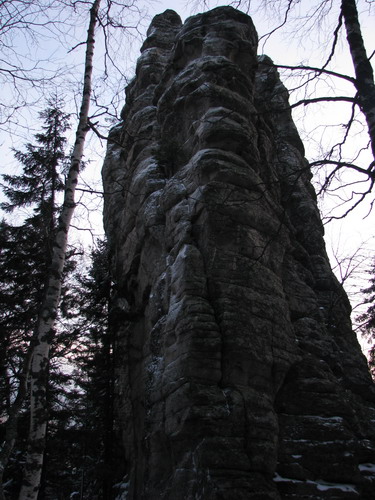 В зимнем лесу мы заметили эти великолепные останцы, только уткнувшись в них носом, и от этого впечатление ещё усилилось. Долго ходим вокруг, разинув рты, фотографируем. Приятно, что отсутствуют надписи типа: «Ося и Кися были здесь». Туда бы на целый день, да с верёвко-карабинно-касочным хозяйством. Но сумерки поторапливают, и мы снова идём к стрелке, где вновь встречаемся с челябинскими друзьями, разъезжающими по окрестностям на квадроцикле. Ещё раз прощаемся и уже в потёмках идём к лагерю.