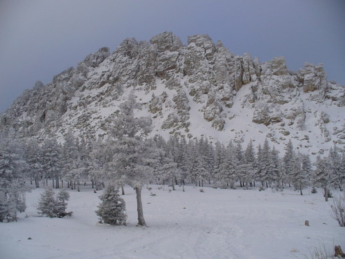 Через эту красотищу выходим к подножью Откликного гребня. Зрелище завораживает. Ползаем по сугробам перед скалистым хребтом гигантского динозавра. Высота красавца – 1155 метров. Штурмовать не решаемся, хотя наблюдаем, как спускается группа без специального оборудования. Время дорого, и мы к огромной радости сторонников здравого смысла гарцуем назад до развилки и далее в сторону Круглицы. Иногда со вздохами тайком залезаем на подворачивающиеся по пути каменные останцы.
